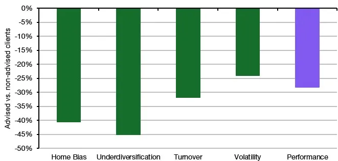 Below is a chart that summarises the key differences in terms of portfolio risks and behavioural biases between advised and non-advised clients. A negative number means that clients using an adviser have better (read: less risky) portfolios.