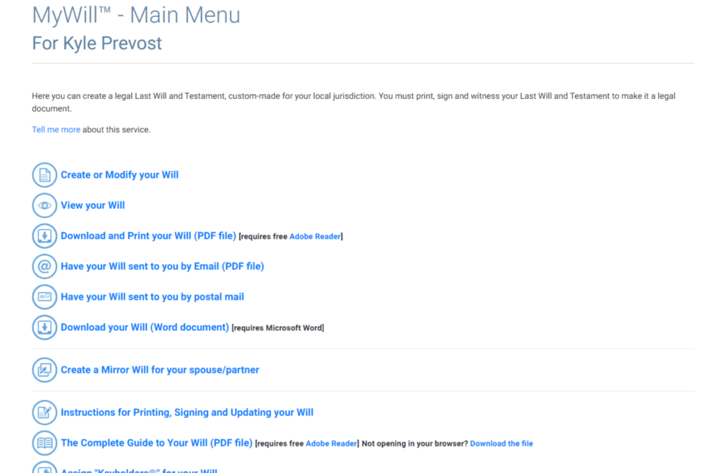 The will that I created was very straight forward, with the main appointments and distributions of my possessions covered in just a couple pages. It simply states that if I were to pass before my wife, she would get all of my assets. If she were to predecease me, or pass away within 30 days of my own death, then I designated my brother to receive all of my assets. Then there were a few additional pages explaining concepts such as exactly what the Executor of my will can and cannot do.