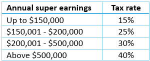 This schedule assumes a ‘normal’ earnings year of 5% on fund balance. The 15% rate up to a threshold of $150,000 is therefore anchored to 5% earned on a balance of $3 million, aligning with the Div 296 threshold below which earnings continue to be taxed at 15%. The 25% rate on $150,000 to $200,000 is a transition zone, then the 30% rate (the second tier Div 296 rate) up to $500,000 corresponds to a 5% return on balances up to $10 million. And the top marginal rate of 40% thereafter reflects the Div 296 effective upper bound.